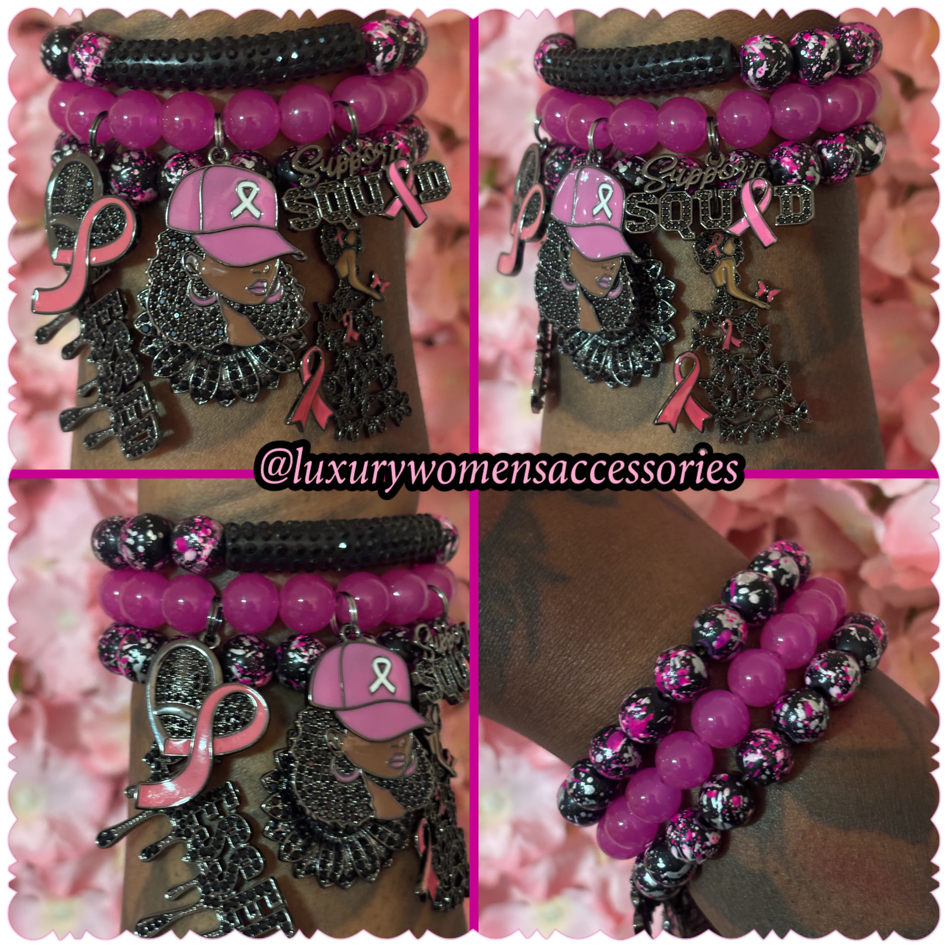 Black/Pink Breast Cancer Awareness Beaded Bracelet Set(set of 3)