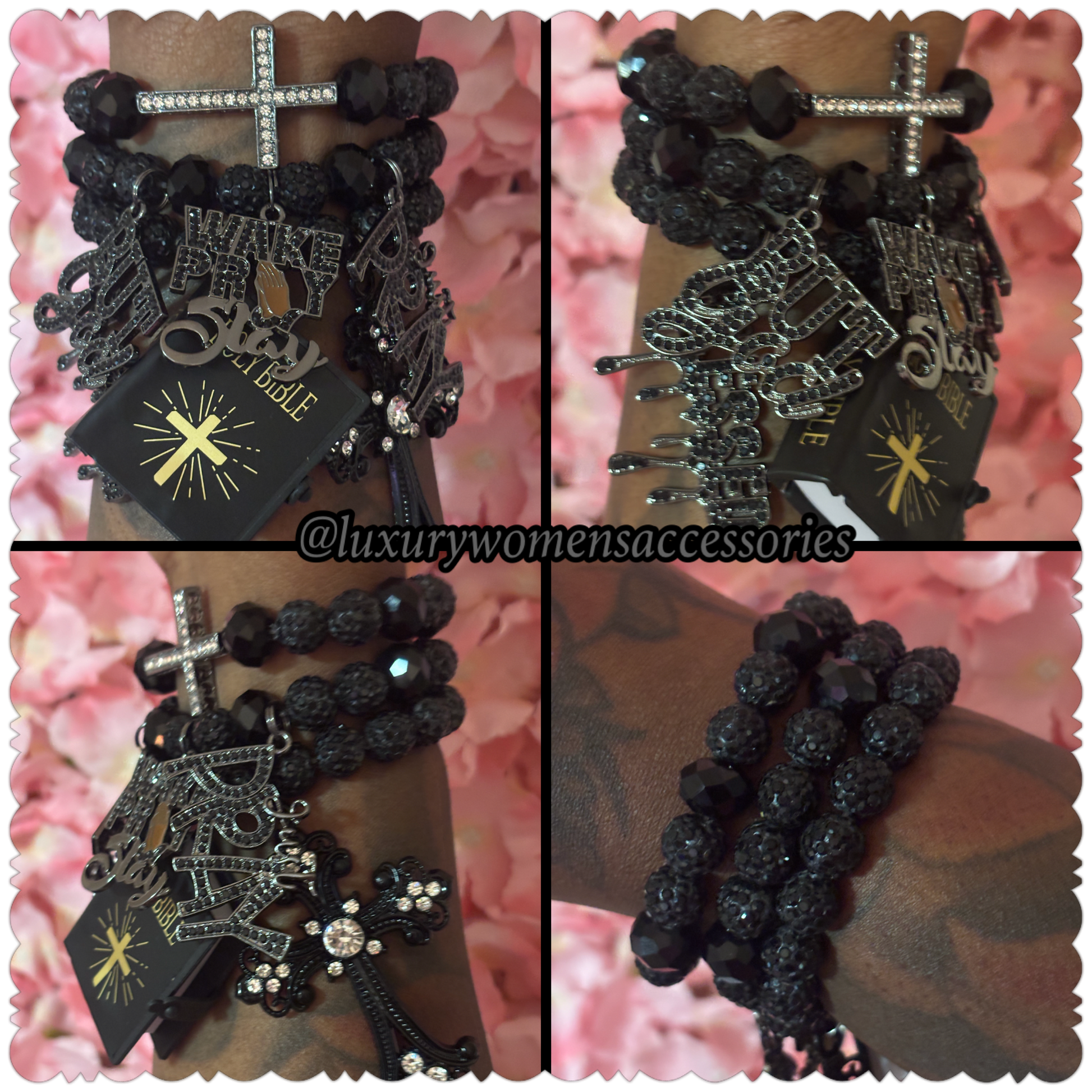 Beautiful set of 3 black luxurious beaded bracelets, remember when times get hard just pray!!!! Bracelets fits size 7 1/2 inch wrist and has minimum stretch. IF YOU NEED A DIFFERENT SIZE ADD SIZE ADJUSTMENT TO ORDER, BRACELETS WILL NOT BE ADJUSTED WITHOUT ADDING SIZE ADJUSTMENT TO ORDER!!!!