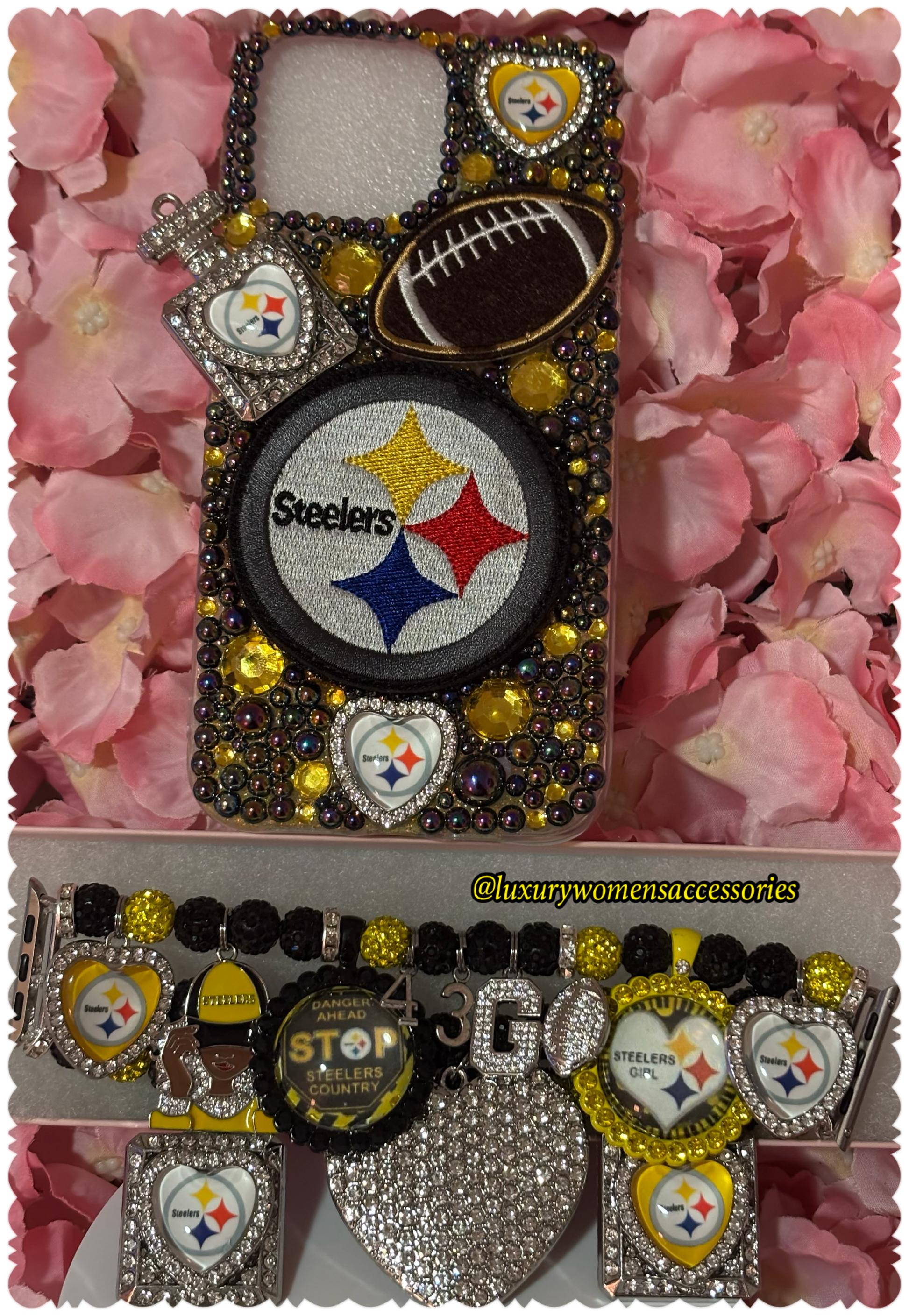 Leave your desired sports team in the notes section at checkout and I will create to perfection based on your team colors!!! Beautiful made to order bling phone case and matching watchband. Bling luxury cases comes with mixture of bling charms, rhinestones, jewels etc created to perfection with a matching watchband for the stylish diva who loves to stand out from the rest If you have questions about a theme/design send me a message on the website chat and we can discuss your ideas to bring to life!!! (CHARMS WILL DIFFER ON EACH SET!!!)AVAILABLE IN APPLE AND SAMSUNG MODELS