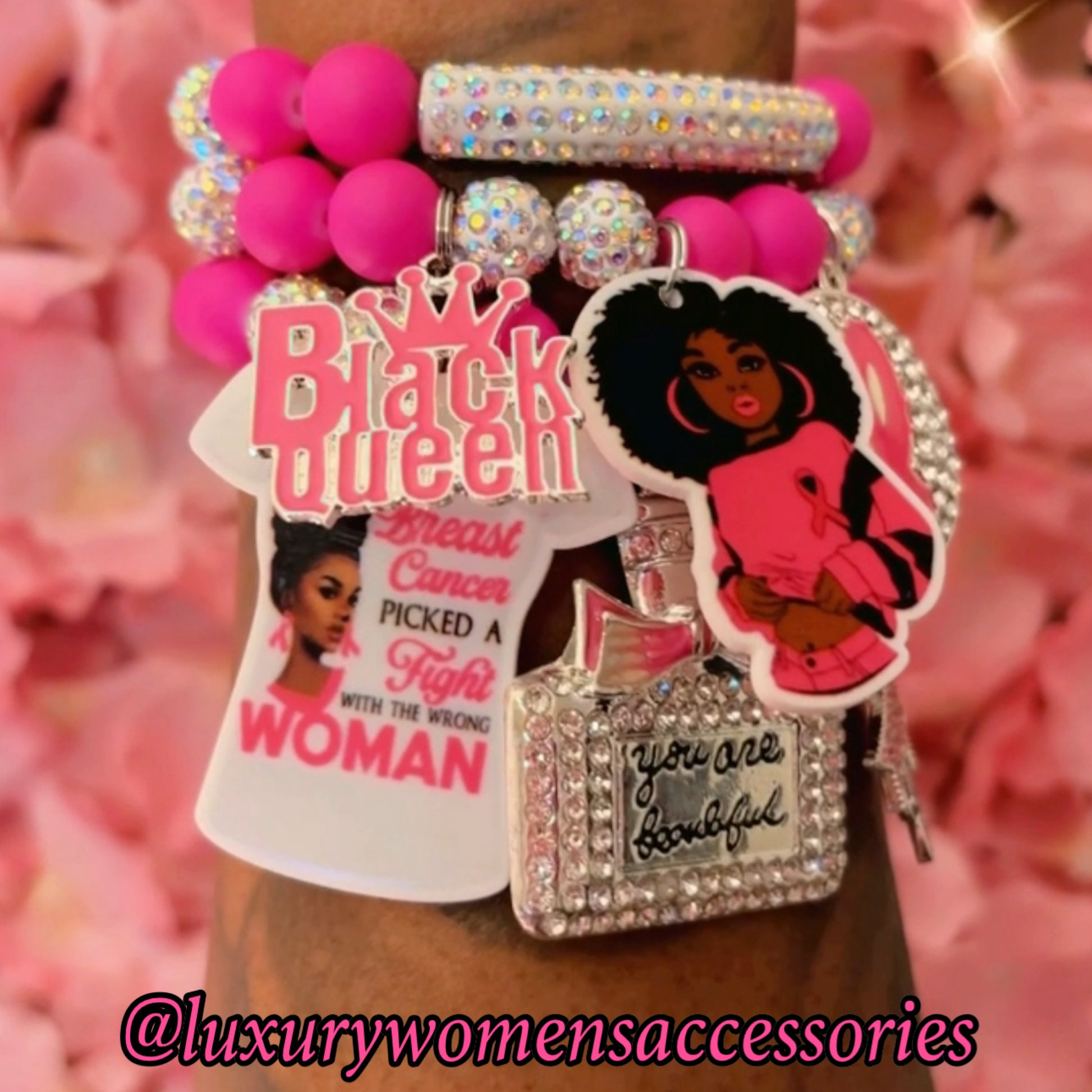 beautiful 10MM beaded bracelets, bracelets are beautifully handmade with stylish matching charms, perfect for the diva who kicked breast cancers butt!!! Bracelets fit size 7-7 1/2 inch wrist and bracelets has minimum stretch. IF YOU NEED A DIFFERENT SIZE ADD SIZE ADJUSTMENT TO ORDER, WILL NOT BE ADJUSTED WITHOUT ADDING SIZE ADJUSTMENT!!!