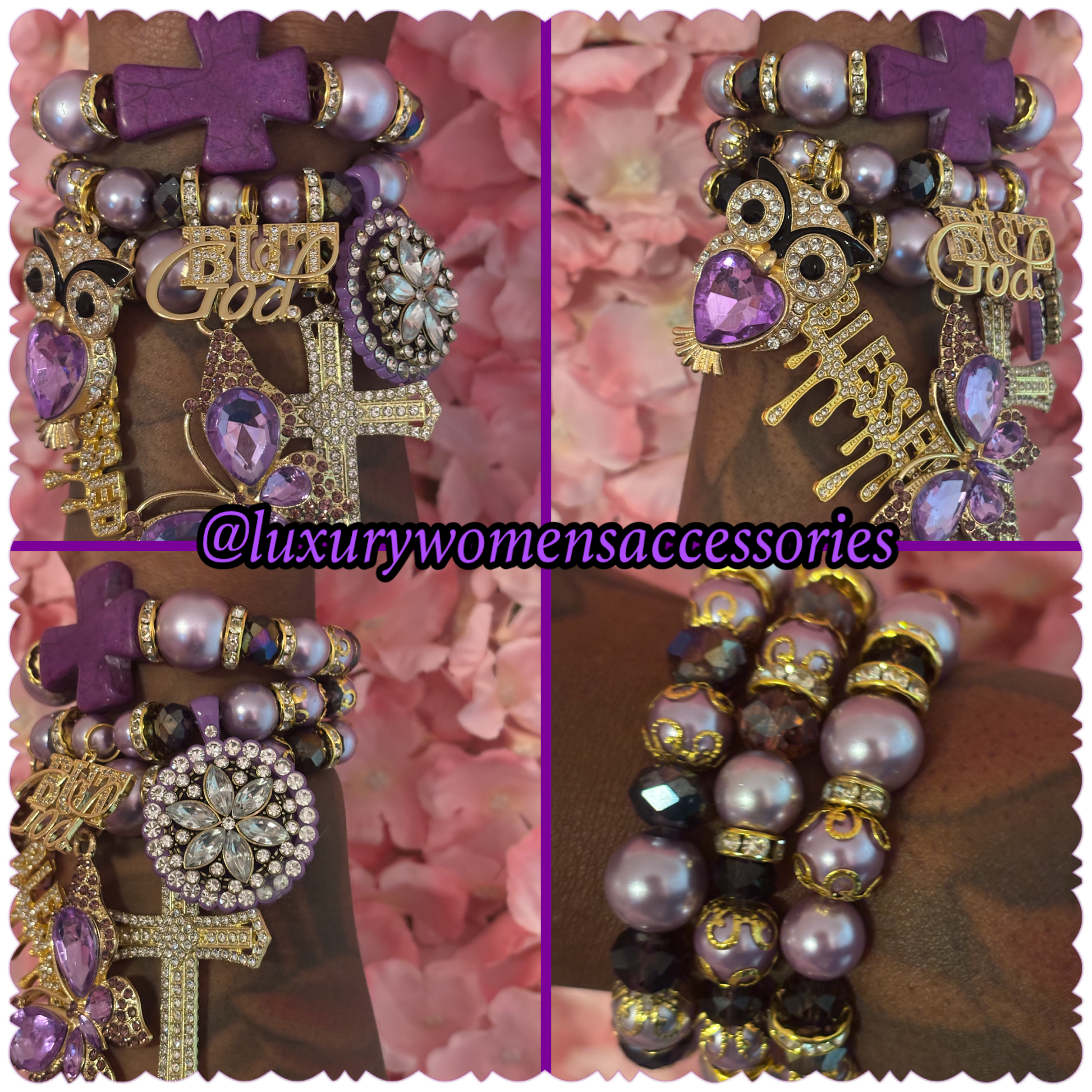 “Luxurious” Religious Purple/Gold Pearl Beaded Bracelet Set(set of 3)