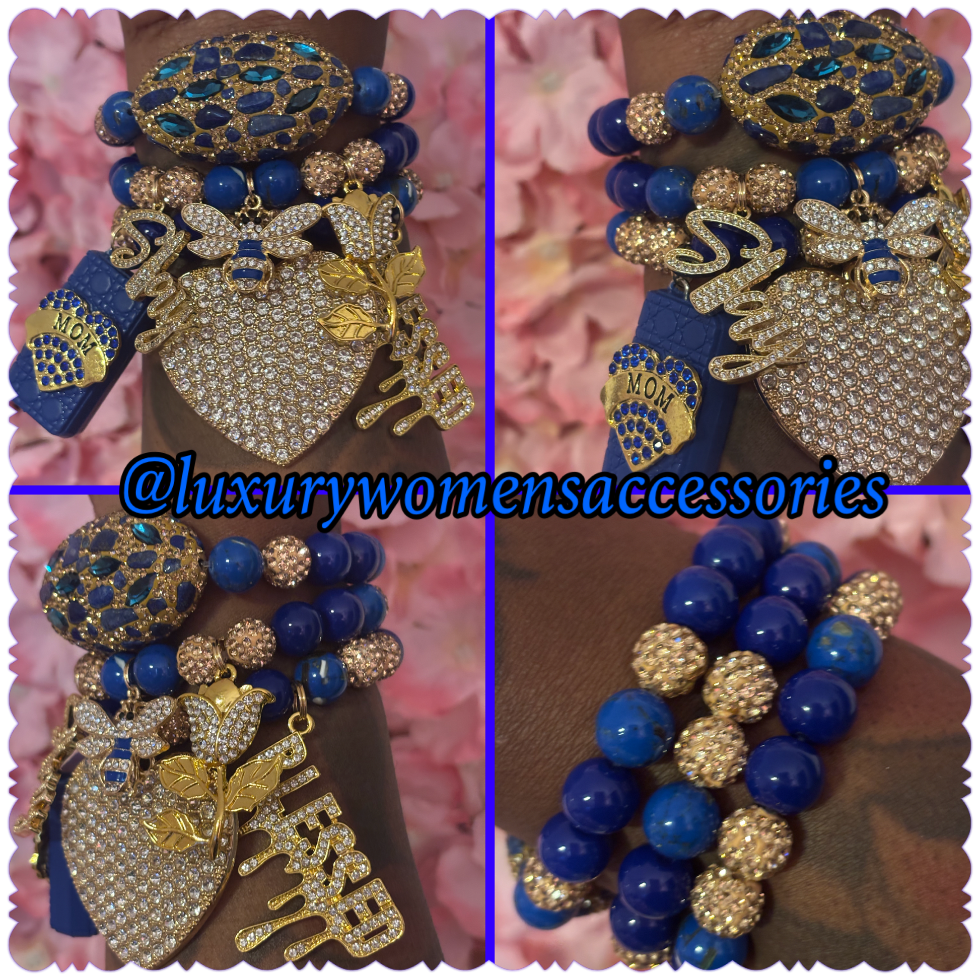 The perfect statement piece!!!! Bold, Unique, Set of 3 beautiful 10MM beaded bracelets, with bracelets are beautifully handmade with 6 stylish matching charms fit for a diva!!!! Bracelets fit size 7 1/2 inch wrist and bracelets has minimum stretch. ( IF YOU NEED A DIFFERENT SIZE ADD SIZE ADJUSTMENT TO YOUR ORDER)