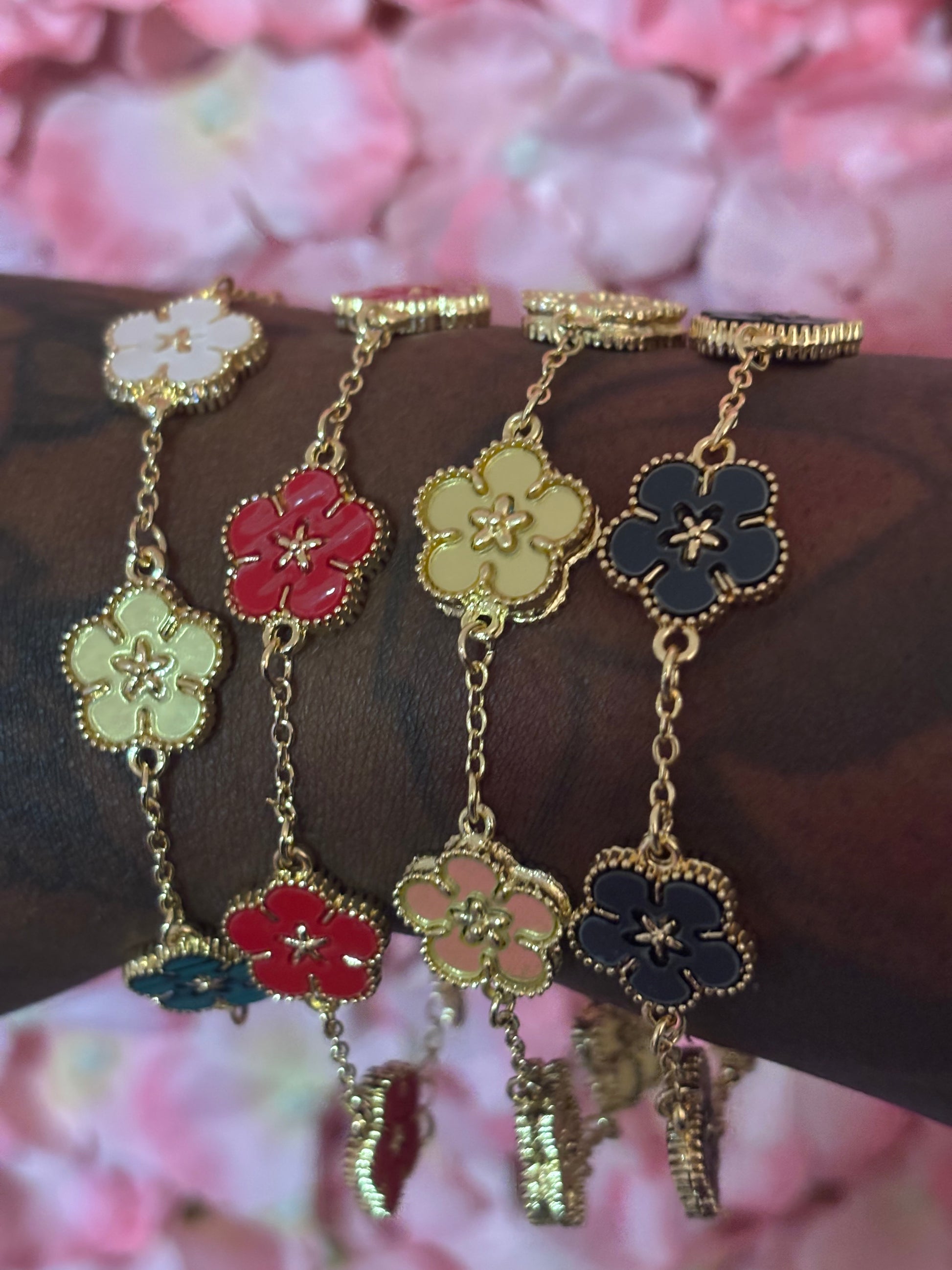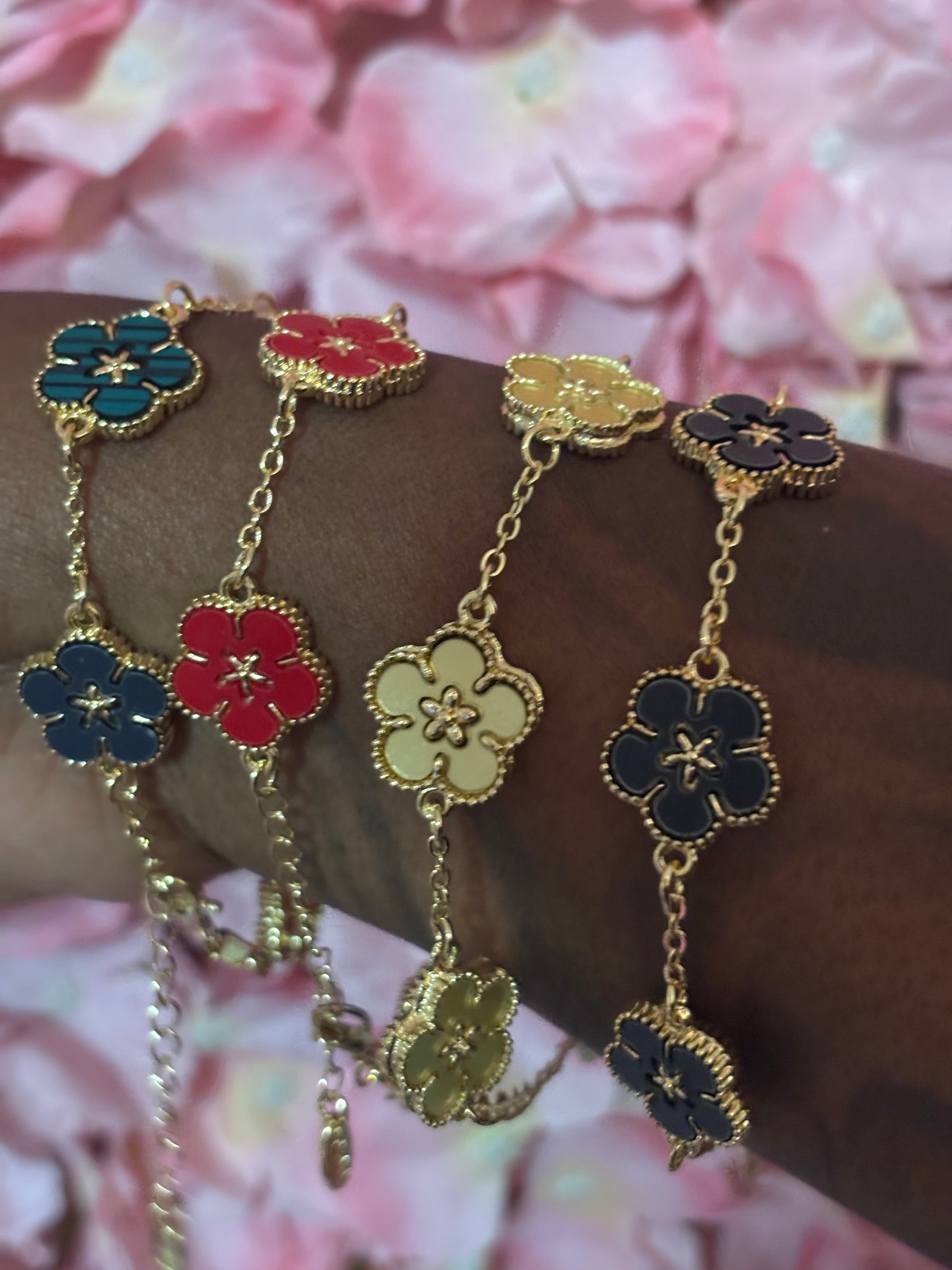 Beautiful flower bracelets, perfect accessory to any outfit!!! Flower bracelets are in available in multi color, red, grayish/black, gold and green(not pictured).