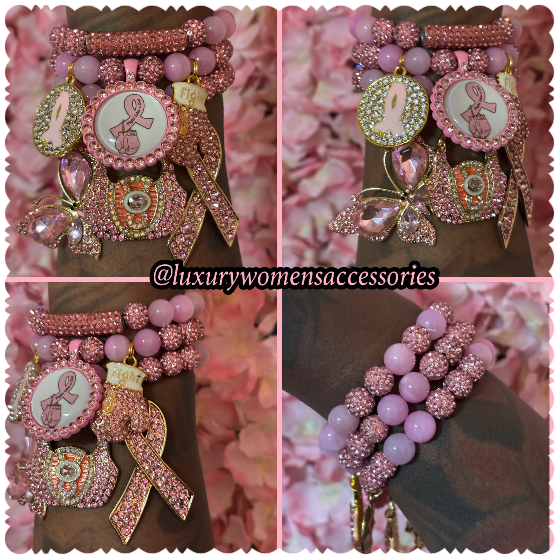 beautiful 10MM beaded bracelets, bracelets are beautifully handmade with stylish matching charms, perfect for the diva who kicked breast cancers butt!!! Bracelets fit size 7-7 1/2 inch wrist and bracelets has minimum stretch. IF YOU NEED A DIFFERENT SIZE ADD SIZE ADJUSTMENT TO ORDER, WILL NOT BE ADJUSTED WITHOUT ADDING SIZE ADJUSTMENT!!!